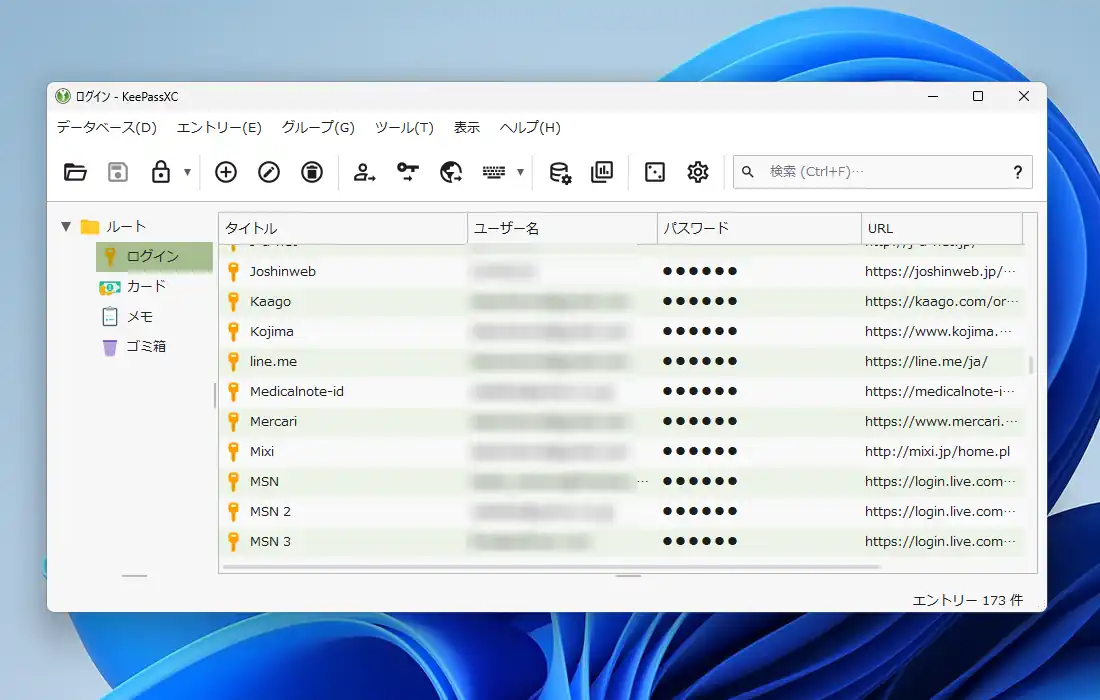 元々パスワードマネージャは何年か前からクラウドでデータを同期するBitwardenを使用しているのですが、万が一に備えてローカルでのバックアップ目的で今年からKeePassXCを使用しています。全く使用していないアカウント含め200以上あったデータを整理して、現在は170件ほどになりましたが、Webサービスにログインする為の大量のIDやパスワードの管理でとても重宝しています。現状ではデータの管理のみで使用していますが、Webブラウザの拡張を使ってBitwardenと同じように自動入力も出来るので、KeePassXCだけで十分かなと思うぐらい完成度の高さに感心しています。特に最近少しずつ流行りつつあるパスキーにも対応している他、Bitwardenで自動入力出来ないフォームにKeePassXCだとあっさり自動入力する事が出来たりします。ただ、クラウド経由で同期を行うBitwardenの方が複数端末で使用する上で管理が楽というメリットもあり、KeePassXCでも似たような事が出来そうではあるのですが、暇な時にでもそこら辺を掘り下げていこうかと考えています。