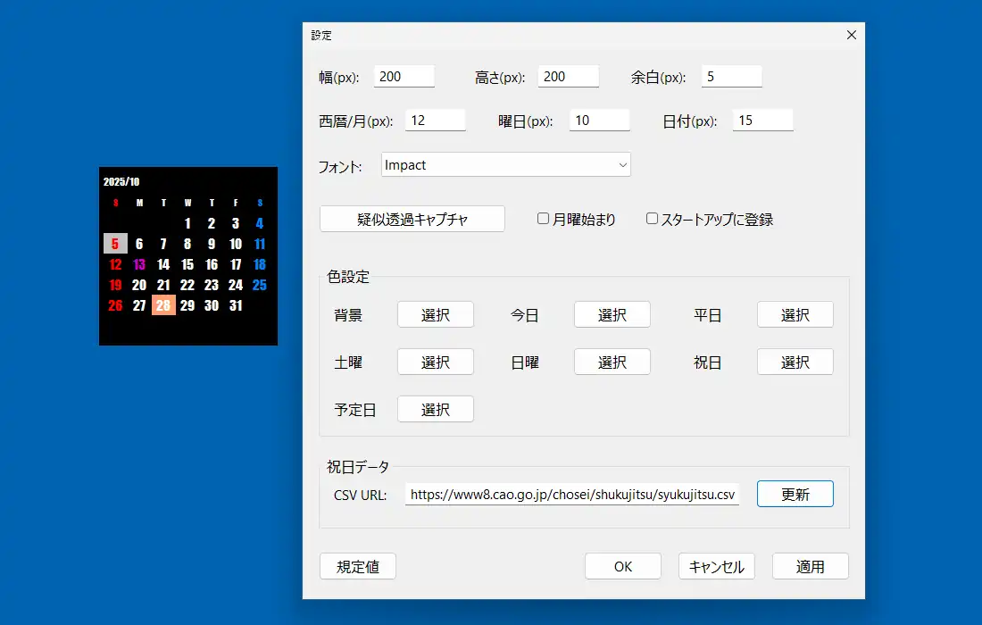 特徴として日本の祝日に完全対応。これは必須の機能として実装していますが標準では空の状態なので設定画面からワンクリックで内閣府のサイトから祝日データをダウンロードして反映させる仕組みになっています。また、カレンダーのサイズやフォント、西暦と月、曜日、平日、土曜、日曜、祝日の各フォント色、予定日と当日の背景色をユーザーで指定出来るようにしています。