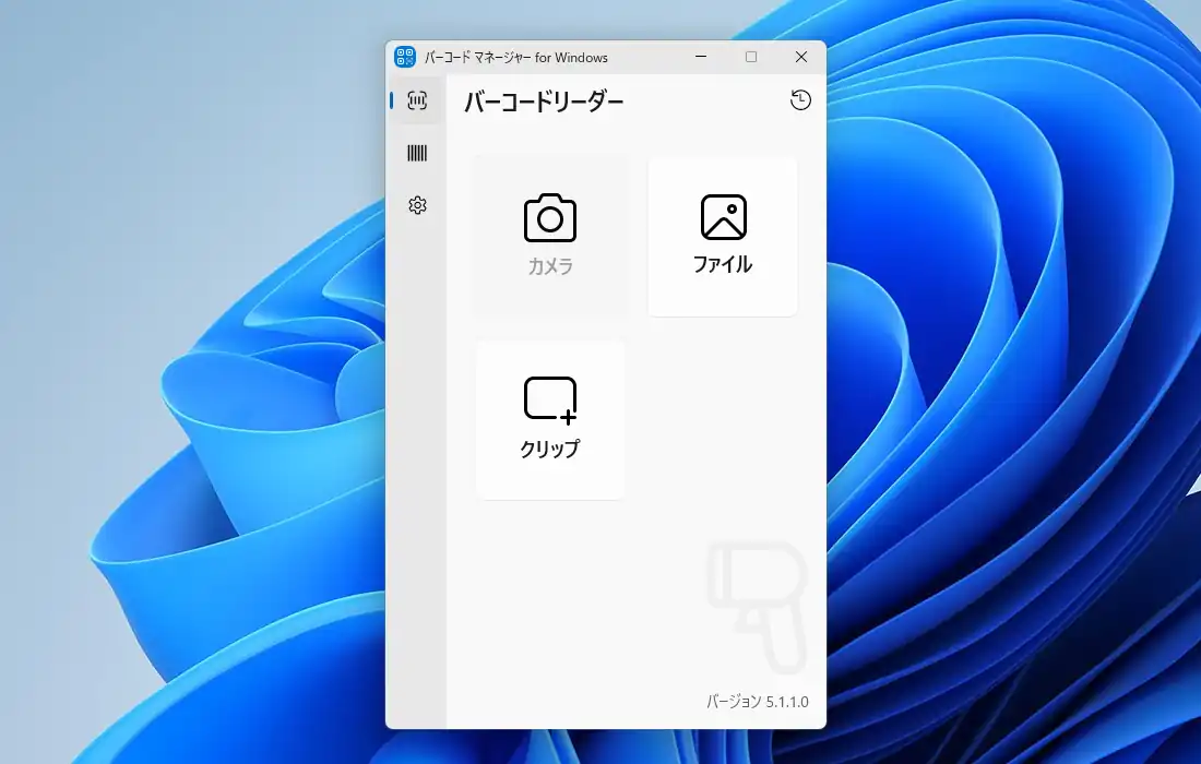 バーコードマネージャーを起動するとカメラ、ファイル、クリップの3つのボタンが表示されますが、筆者のPCにはカメラが接続されていないので、このボタンはグレーアウトしていて使用出来ませんでしたが、接続している場合はカメラからQRコードをスキャン出来る機能だと思われます。ファイルはQRコードの画像ファイルを入力、クリップは画面上を範囲選択からキャプチャしてQRコードを読み取る機能となっています。