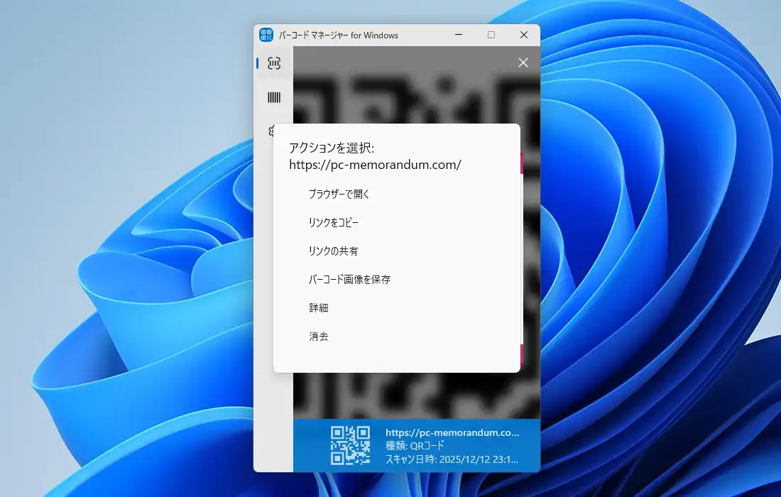 バーコードマネージャーはカメラ、画像ファイル、もしくは画面キャプチャからQRコードをスキャンして情報を表示する機能以外にQRコードとバーコードの作成機能も備えています。QRコードがURLの場合は直ぐに既定のWebブラウザで表示させる事が出来る他、何らかの文字列の場合はメニューからデータのコピーやWeb検索を行う事も出来ます。