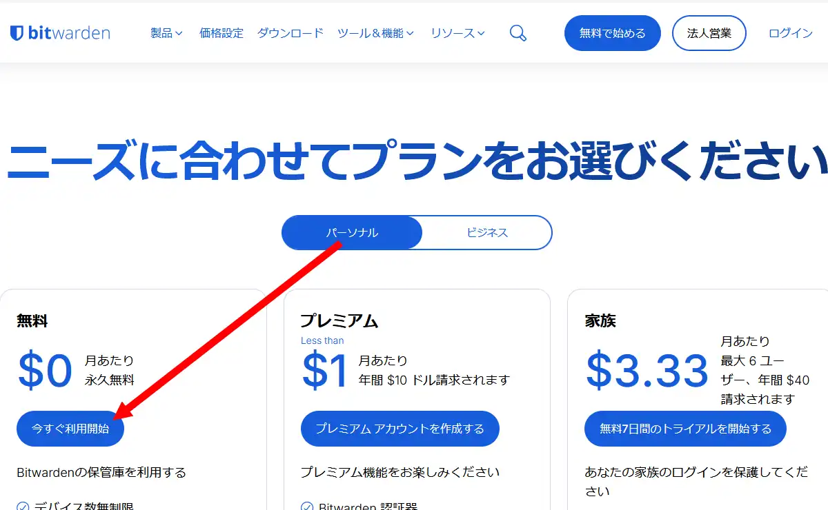 まずはBitwarden公式サイトからアカウントを作成します。ページ上部にある「開始する」をクリック。