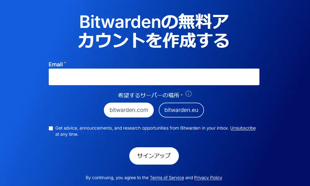 次に表示されるページで「Email」となっている入力欄にメールアドレスを入力します。「希望するサーバーの場所」は標準のbitwarden.com(米国)とbitwarden.eu(ヨーロッパ)から選択出来ますが変更の必要性はないのでbitwarden.comのままで。「Get advice, announcements…」となっている部分はBitwardenからの情報を受け取るかの設定で、必要無ければチェックは不要です。最後に「サインアップ」をクリックします。