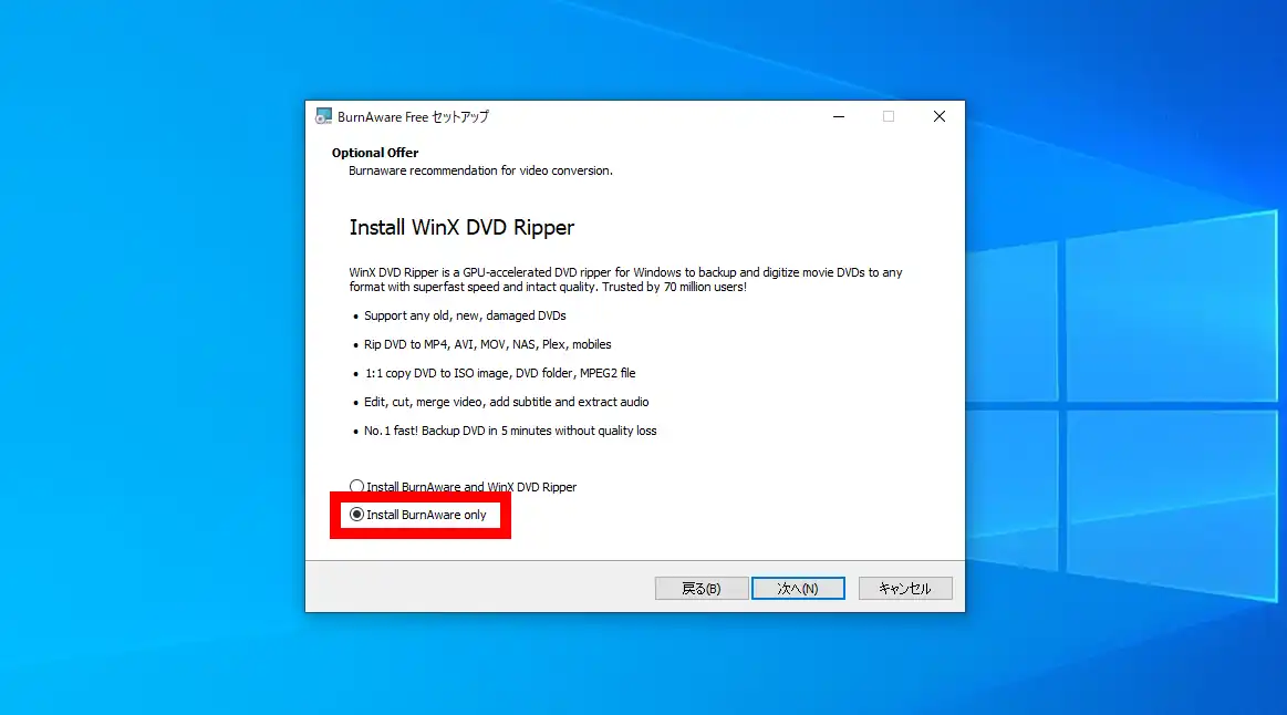 更に現バージョンでは別のソフトウェアのインストールについての画面が表示されましたが、「Install BurnAware only」を選択して進めばBurnAware Freeのみのインストールとなります。