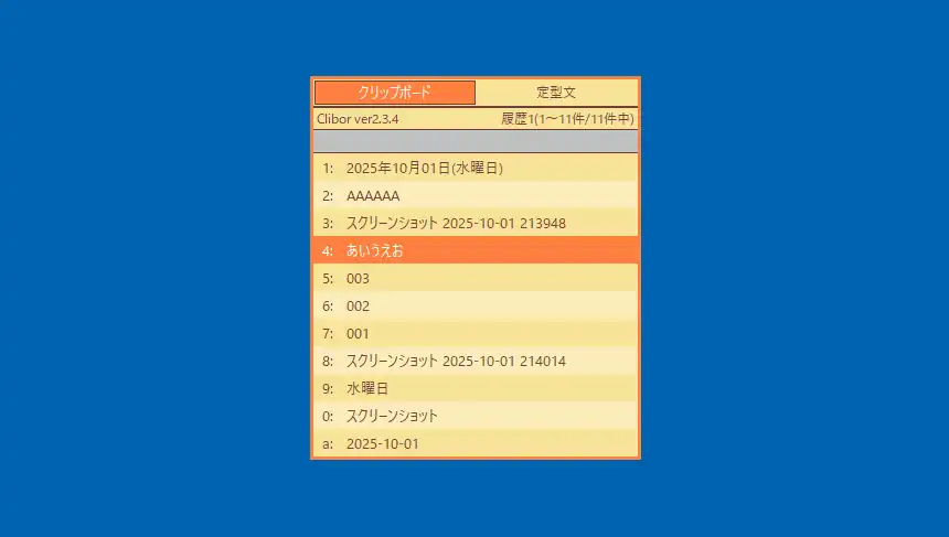 ただ筆者の好みでしかないのですが履歴数によって画面の縦サイズが変わるCliborの仕様はあまり好みではありません。その点では一定の画面サイズで表示されるクリップNOTEの方が好み。また、クリップNOTEのように画面端クリックで表示といった機能は無いのでマウス操作主体では使い易くはないです。逆にキーボード主体での操作では自分が知る限り最も使い易いクリップボード履歴、定型文管理ソフトだと思います。