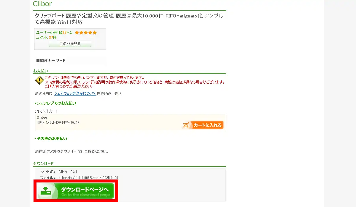 Cliborの作者公式サイトはチグサウェブとなっておりCliborの情報もここに掲載されています。但し公式サイトからは配布されていないので、ダウンロードは現在Vectorと窓の杜から行えます。Vectorでは価格が表示されていますが、これは寄付を行う場合でありCliborは無料で使用出来るフリーソフトです。