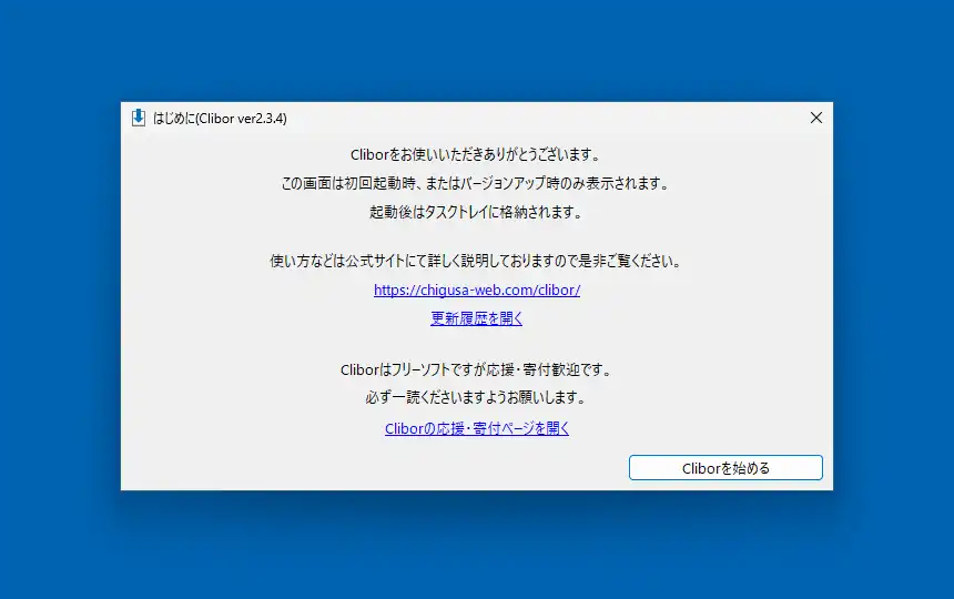 ダウンロードした圧縮ファイルを展開後、適当な場所に配置。中身のClibor.exeを実行して起動すると初回時に「はじめに」という画面が表示されます。この画面の説明文に記載されている通り、Clibor起動後はタスクトレイ(システムトレイ)に最小化されています。