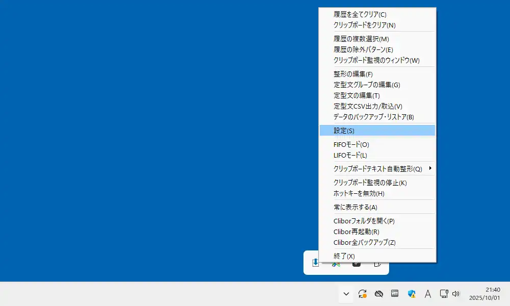 システムトレイに最小化されているCliborのトレイアイコンを右クリックするとメニューが表示されるので、ここから「設定」を選んで設定画面を表示します。