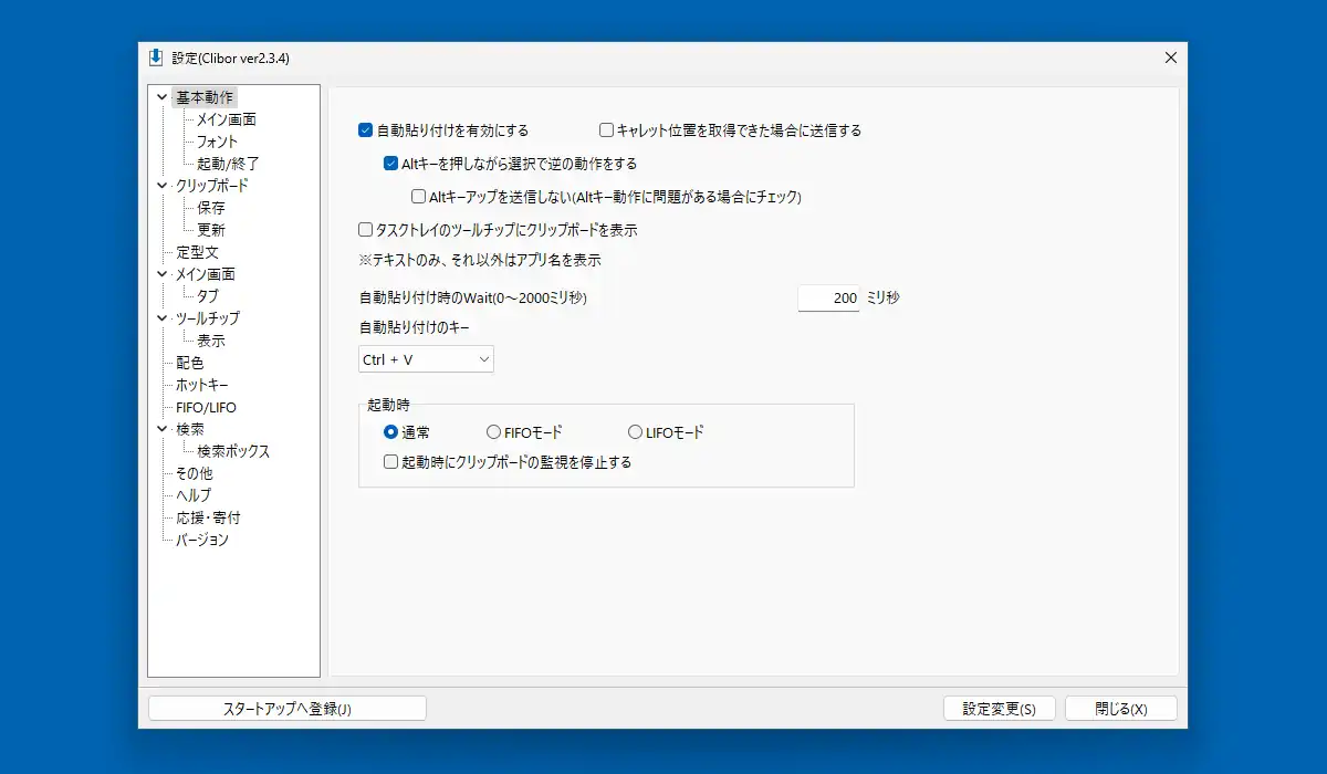最初に表示される「基本動作」では自動貼り付けの有無があります。筆者は誤操作に繋がりやすいという理由からどのソフトでもこの手の機能は無効化しますが、無効化していてもその下の「Altキーを押しながらの選択…」を有効にしておけばAltキーを押しながらの操作で自動貼り付けを行えます。