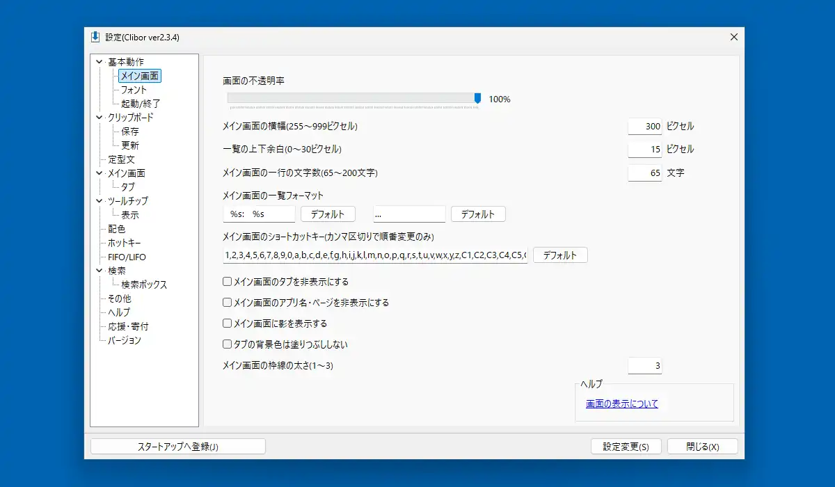 「メイン画面」の項目を見ていきます。ここでは画面の不透明度や横幅、上下の余白といった外観に関連する設定が多くあります。「メイン画面のショートカットキー」はコピーした履歴や定型文に割り当てられるキーで、好みのキーを入れる事は出来ませんが入れ替えは可能です。例えば0,1,2といった並びに変更可能。