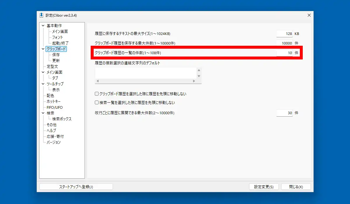 「クリップボード」を見ていきます。ここでは保存の最大サイズや最大件数の他、「クリップボード履歴の一覧の件数」があります。この設定がかなり重要で、ここにずっと気付かないまま使っているとコピー履歴が増える度に画面がどんどん縦長になります。筆者の感覚では10件から15件ぐらいが妥当。また、履歴が複数ページに分割された際はホイール回転でページを切り替える事が出来ます。