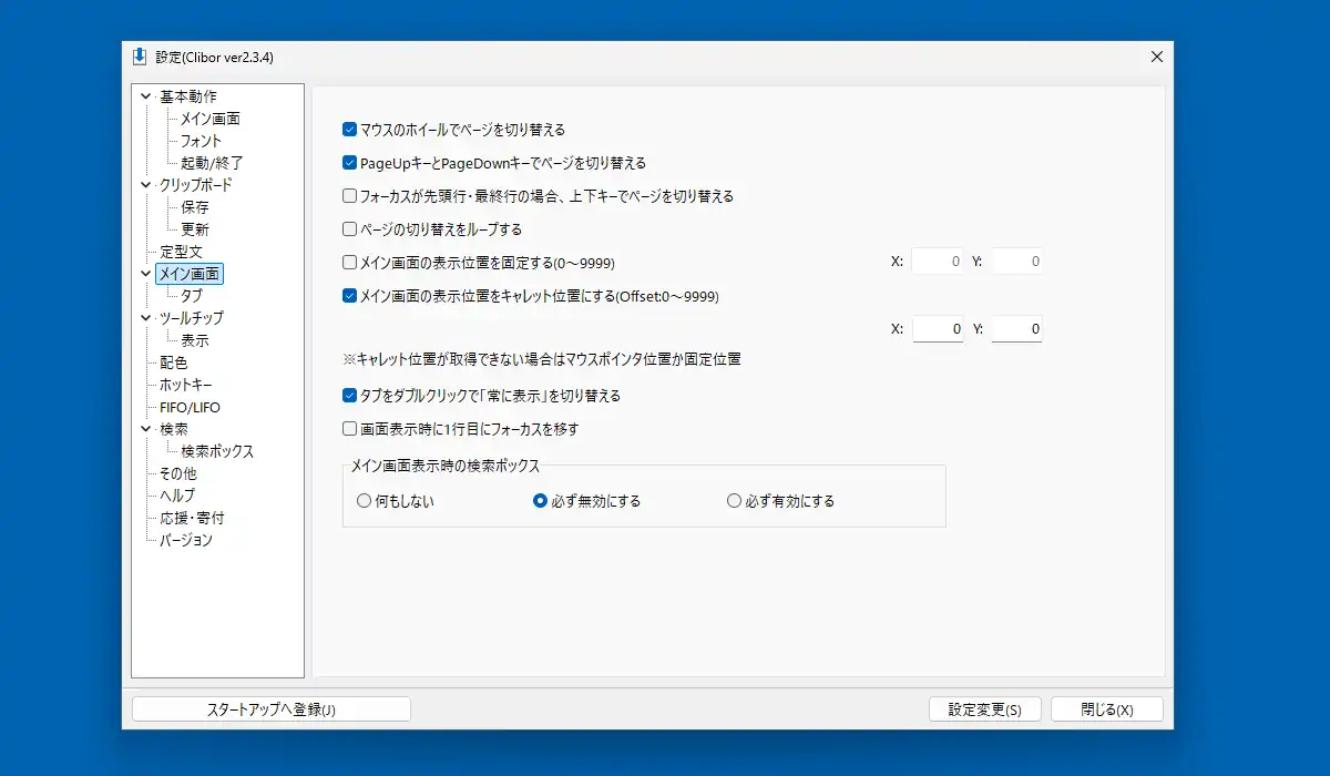 幾つかの設定を飛ばして「メイン画面」を見ていきます。ここには履歴や定型文のページ切替操作や画面の表示位置の設定があります。「メイン画面の表示位置を固定する」を有効化して座標の位置を入力しておくとホットキーで呼び出した時に常にその位置で表示させる事が出来ます。その下の「メイン画面の表示位置をキャレット位置にする」ではキャレットから見た表示位置の設定となります。どちらも有効な場合はキャレットが無い状態なら表示位置を固定で入力した位置、キャレットがある状態ならキャレットからの位置で入力した位置が優先されます。