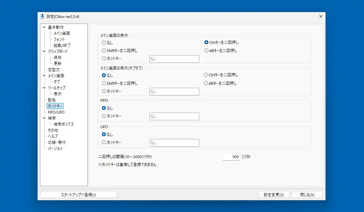「ホットキー」を見ていきます。Cliborの画面を表示させる為のキー設定となります。標準でCtrlキー2連打となっていますが「ホットキー」を有効にして直接キーを入力する事でユーザ指定のキーを登録出来ます。勿論装飾キーの組み合わせによる3つのキーを登録する事も可能。その下のサブタブは標準設定のままなら定型文画面を表示するホットキー、FIFOやLIFOの欄はFIFO機能やLIFO機能の実行キーとなります。