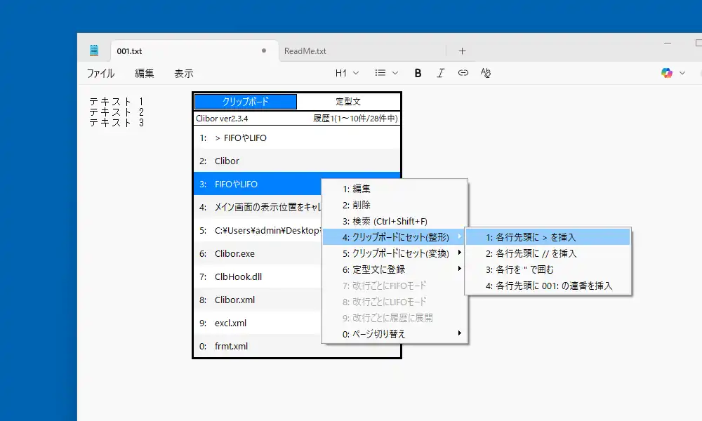 FIFO/LIFOについて。何だか小難しい印象がありますが、要領を覚えれば簡単。仮にFIFOを実行してテキスト 1、テキスト 2、テキスト 3を順にコピーしたとします。普通のコピーなら最後にコピーしたテキスト 3しか貼り付けが出来ませんが、FIFOが実行されていればこの後に貼り付け操作を行うとテキスト 1、テキスト 2、テキスト 3の順で貼り付けられます。LIFOはその逆にテキスト 3、テキスト 2、テキスト 1の順で貼り付けとなります。要は複数のコピーを順に貼り付けられる機能です。どのような場面で使用するのかは筆者も思い付きませんが、大量のテキストの編集を行っている時に便利な機能じゃないのかと想像します。