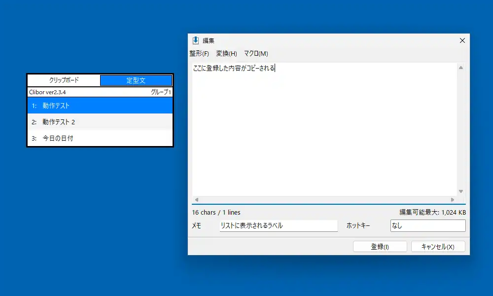 定型文画面は初期状態では空となっていますが、右クリックメニューに表示される「新規登録」から編集画面が表示されます。上部の入力欄はクリックやEnter時にコピーされる内容で、下の「メモ」の部分はリスト上に表示されるラベルとなります。また、マクロを追加して今日の日付や現在の時間を定型文からコピーするといった事も出来ます。