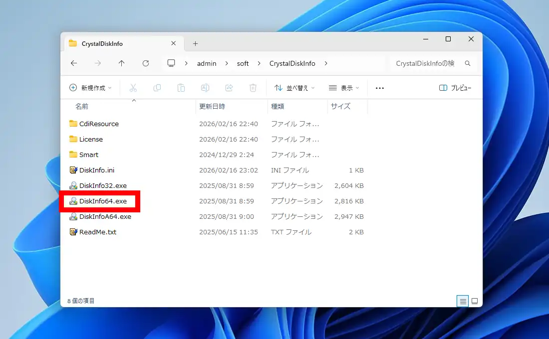 インストーラをダウンロードした場合はウィザードに従ってインストール、ZIP版をダウンロードした場合は展開後に任意の場所に配置。中には3つの実行ファイルが含まれていますが、「DiskInfo32.exe」は古いPC環境用で、殆どのユーザーは「DiskInfo64.exe」を使用します。因みに「DiskInfoA64.exe」となっているのはARM64版(Windows 11 on ARMやWindows 10 on ARM)用となっています。