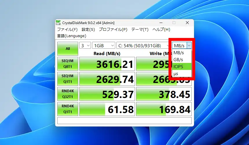 右端のメニューから測定結果の単位を切り替える事が出来ます。「MB/s」は1秒間で何MB読み書き出来るか、「GB/s」は単位をGBにしただけで意味は同じ、「IOPS」は1秒間に実行出来る読み書き処理の回数を示した数値、「μs」は1回の処理にかかる応答時間を示した数値となります。また、「μs」の場合は数値が小さいほど高速に処理出来ているという事になります。