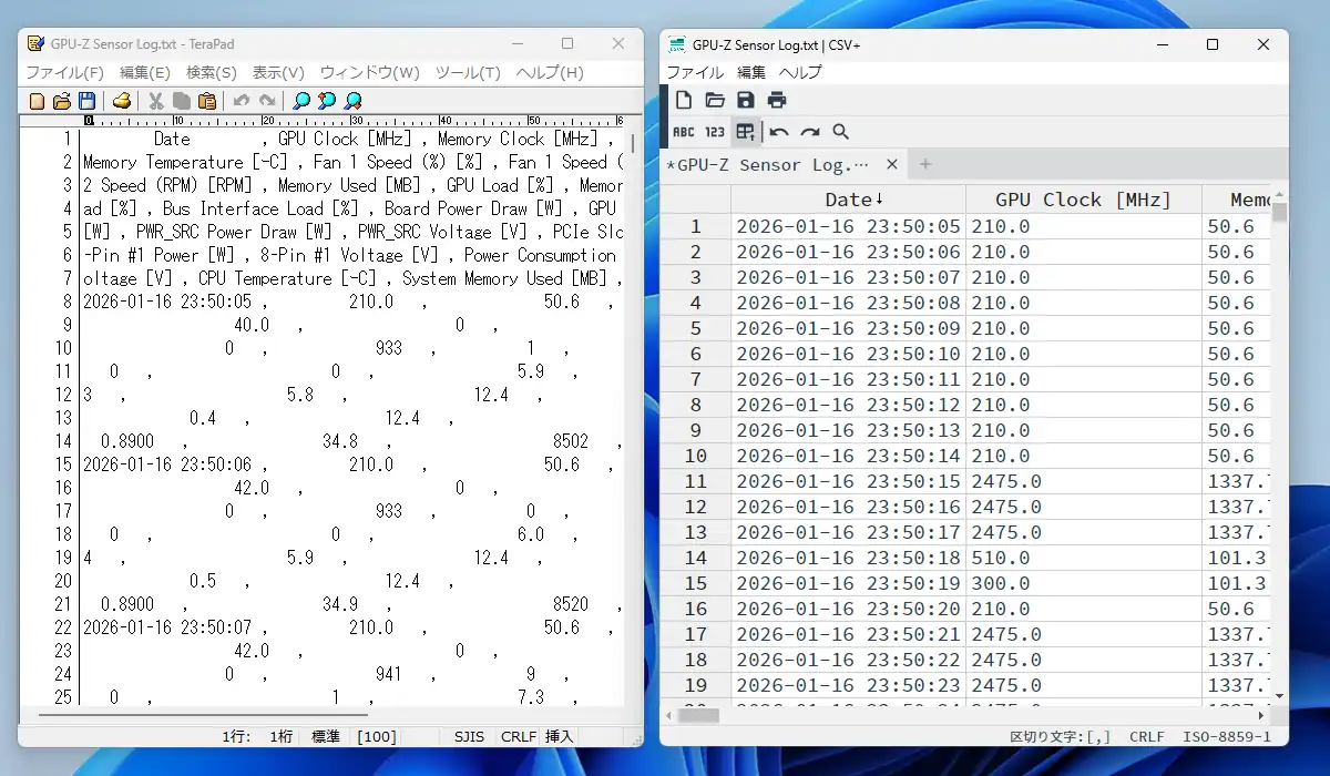 分かりやすく一般的なテキストエディタ(TeraPad)と比較してみると下のようになります。CSVファイルを左の通常のテキストエディタで開くとバラバラに表示される内容が、右のCSV+ではセルで区切られて表示されているのが分かります。逆にCSV+は通常のテキストファイルの編集は出来ない事は無いものの向いていません。CSV/TSV形式専用のエディタとなっています。