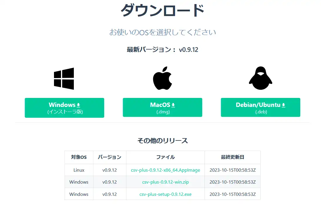 公式サイトのPlus oneからリンクを辿りCSV+のダウンロードページへと移動します。Windows用はインストーラ版とZip版の2種類が配布されていますが、筆者はZip版をダウンロードしました。