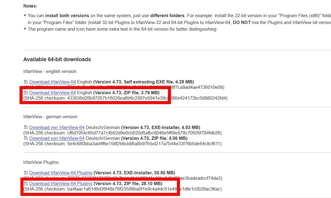 IrfanView公式サイトの目立つ位置にある「DOWNLOAD」ボタンからだとインストーラ版のダウンロードとなりますが、上部メニューの「DOWNLOAD」からダウンロードページを表示すると圧縮ファイル展開後に即使用出来るZIP版をダウンロードする事が出来ます。更に下にプラグインパッケージのダウンロードリンクもあるので、併せてダウンロードしておきます。
