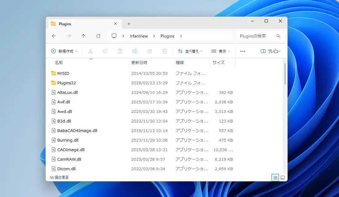 筆者はZIP版をダウンロードしたので、ここからはZIP版ありきで話を進めていきますが、IrfanViewの圧縮ファイル展開後に任意の場所に配置して中にある「Plugins」フォルダ内に上で一緒にダウンロードしておいたプラグインファイルをコピーします。