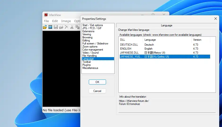 「i_view64.exe」を実行してIrfanViewを起動します。まずは上部メニューにある「Options」-「Change Language」から言語選択画面を表示。