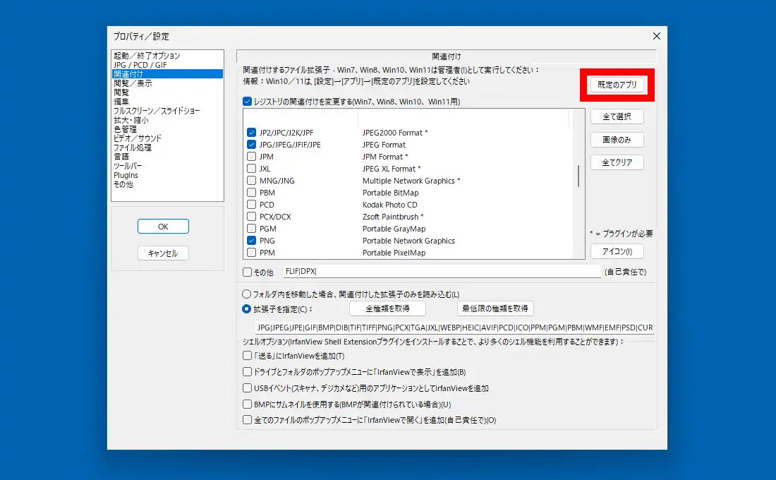 「オプション」-「プロパティ/設定」で「関連付け」を見ておきます。この画面は特定のファイルをダブルクリックした時に自動でIrfanViewで開くという設定ですが、IrfanViewに限らず以前からソフト側の操作で関連付けが出来なくなっています。画面内にある説明文にもある通り10/11では「既定のアプリ」から関連付けを変更します。