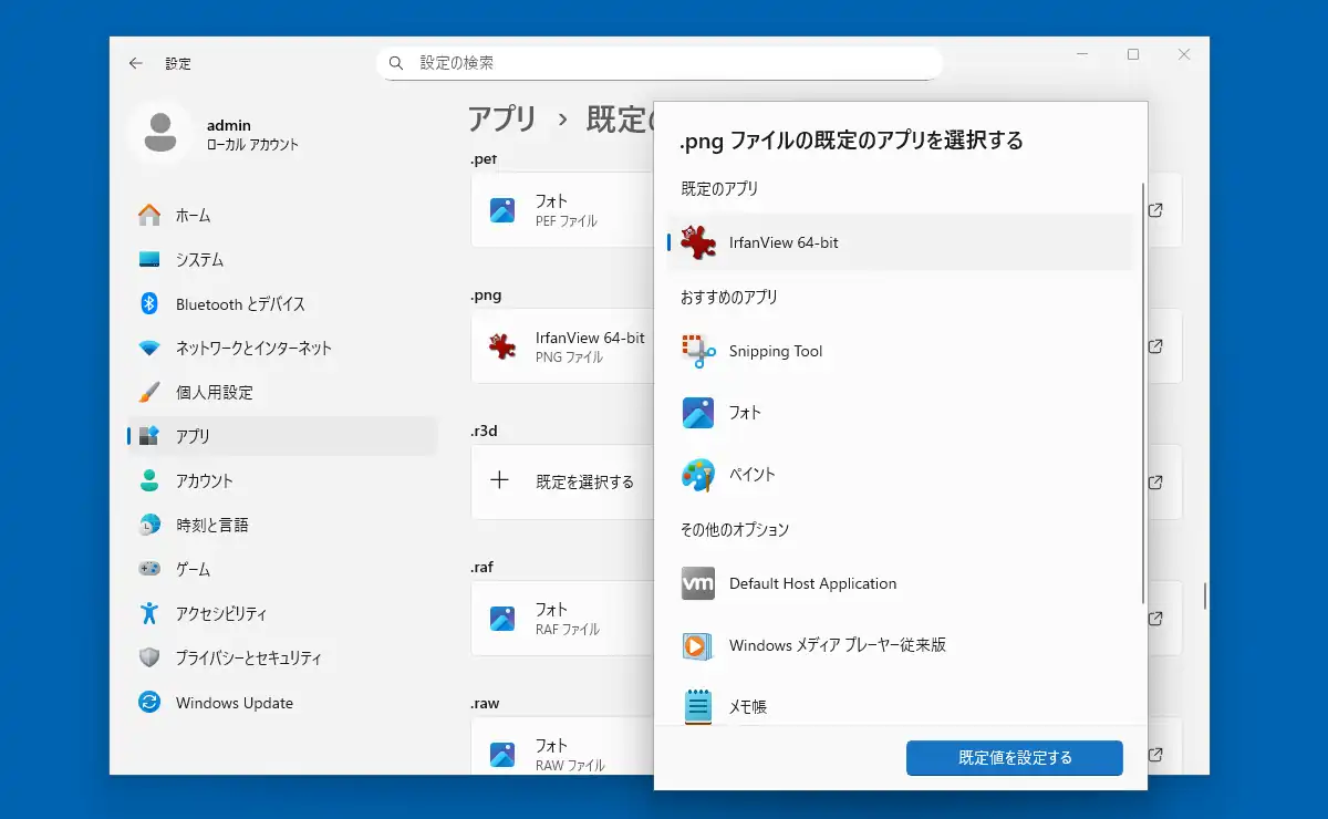 既定のアプリ画面を開いたら「フォト」を探し出し、「フォト」に関連付けされている画像ファイルの既定のアプリをIrfanViewに変更します。もしくは直接ファイルを右クリックしてメニューの「プロパティ」からプログラムの「変更」でIrfanViewに関連付けする事も出来ます。