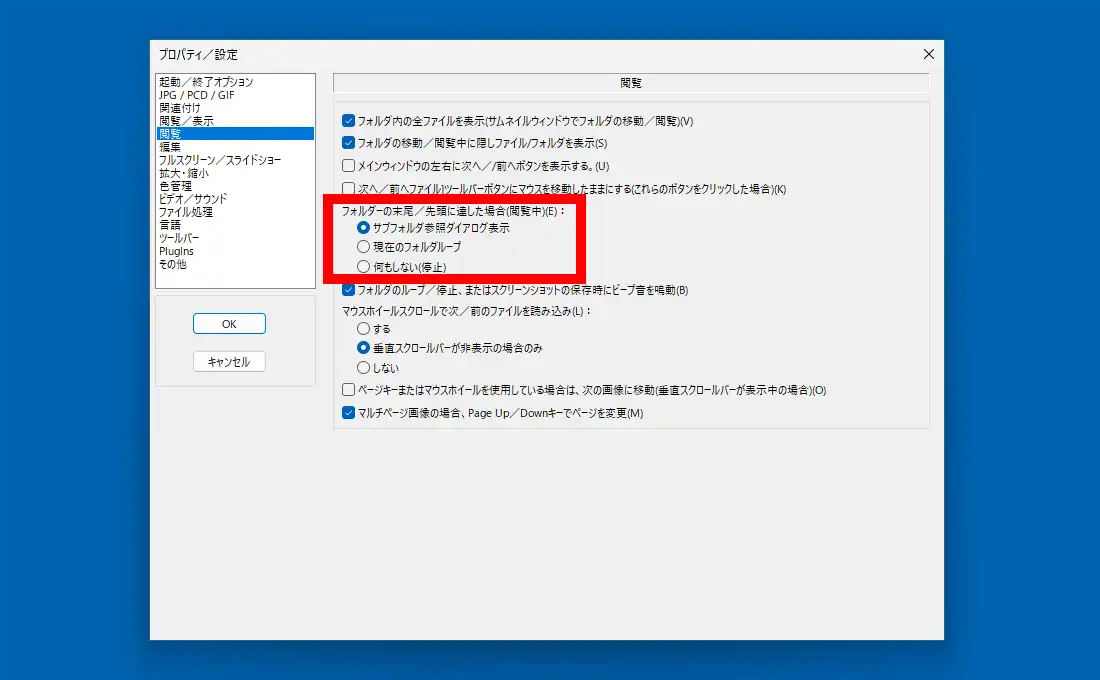 他、「閲覧」にある「フォルダーの末尾/先頭に達した場合」は標準でダイアログが表示されるようになっていますが、これがかなり煩わしいので場合によっては「何もしない」に変更。それ以外では「メインウィンドウの左右に次へ/前へボタンを表示する」は画面の左右端に移動ボタンが表示されるようになり私的には便利ですが、少しボタンが大きいので場合によっては邪魔になるかもしれません。