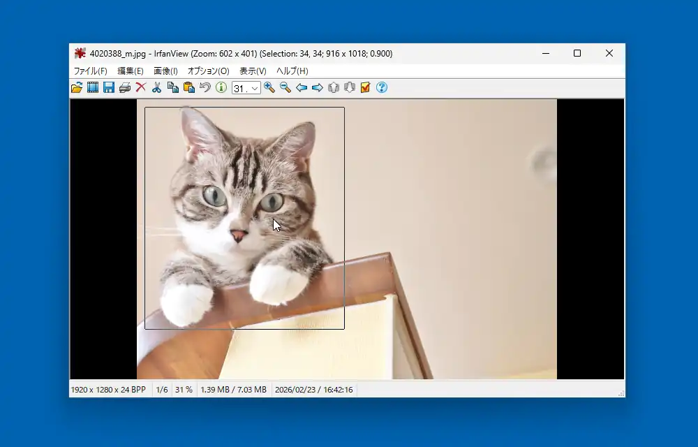 IrfanViewはただ画像を表示する以外にちょっとした編集機能も備えています。入力した画像上でドラッグすると範囲選択出来るので、「編集」-「選択範囲をトリミング」で選択した部分のみを切り出す事が出来ます。また、選択範囲は端をドラッグして範囲を再調節したり右ドラッグで範囲全体の移動が出来ます。