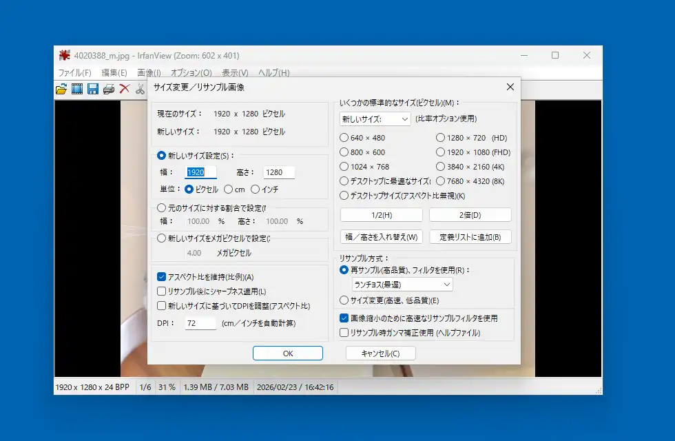 また、メニューの「画像」からは様々な色調変更や「フィルタ」からぼかしやモザイクといった編集も行えますが、最も用途が多いと思われる「サイズ変更/リサンプル」から、画像を指定サイズに縮小、もしくは拡大出来ます。ピンクセル単位でのリサイズ以外に%指定の比率でのリサイズも可能です。