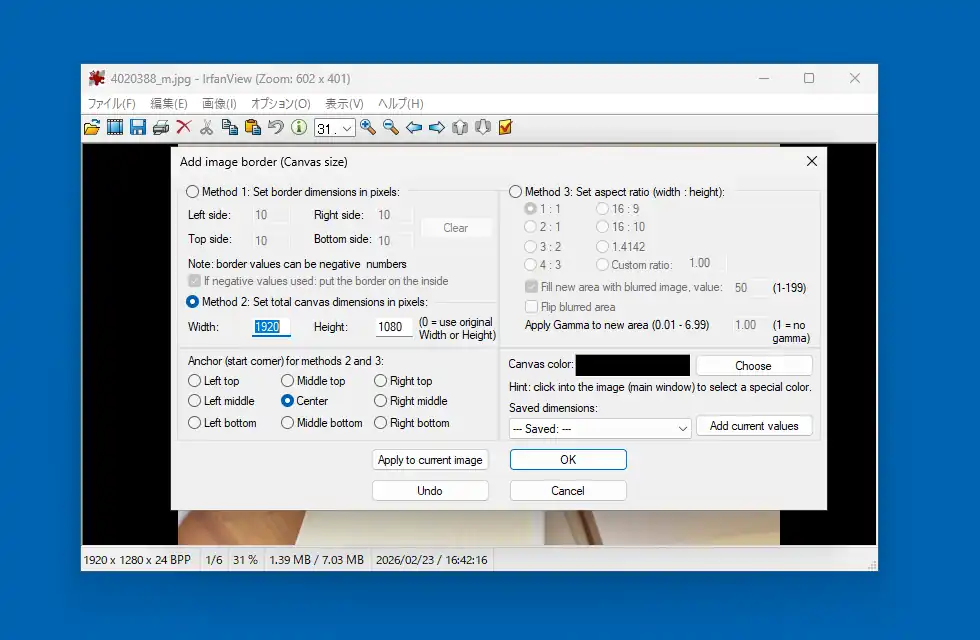 同じく「画像」メニューにある「キャンパスサイズ変更」では現状日本語化されていませんが、全体から指定サイズに切り抜く機能です。「Method 1」は左右上下の削除範囲を数値で指定、「Method 2」は全体のサイズを指定、「Method 3」はアスペクト比(縦横比)で指定しますが、2と3の場合は「Anchor (start comer) …」で、どの位置から基準にするかを指定します。