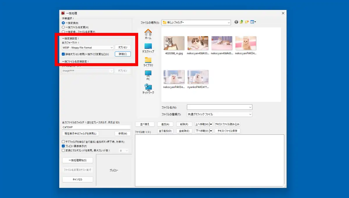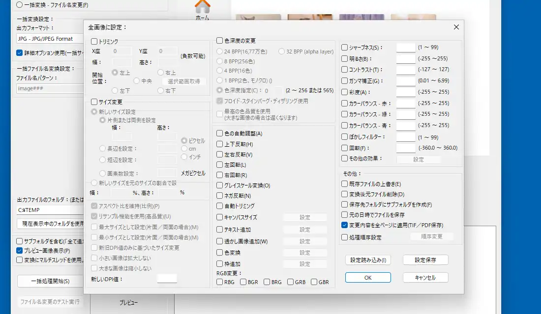 更に「詳細オプション」を有効化して「詳細」ボタンからトリミングやサイズ変更、色深度の変更、色の調整、反転、回転、テキストの挿入、透かし画像の挿入、シャープネス、明るさ、コントラスト、ガンマ補正、彩度他、様々な編集を一括で行う事も出来ます。