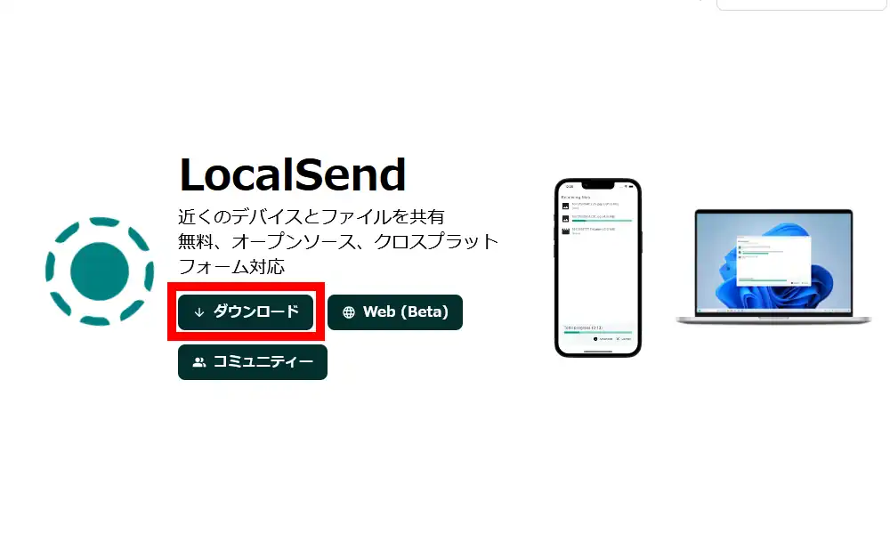 LocalSendの公式サイトにアクセスします。「ダウンロード」の記載のあるリンクからダウンロードページへ移動します。