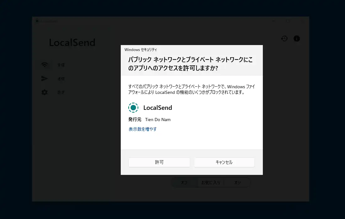 LocalSendの初回起動時にネットワークへのアクセスを許可するかの画面が表示されるので「許可」を選択してこの画面を閉じます。