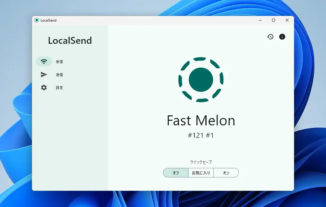 最初に「受信」画面が表示されますが、右上のボタンから受信ファイルの履歴画面の表示と下部から簡易設定の変更が出来る以外、この画面で操作する箇所はありません。因みに画面に「Fast Melon」の記載がありますが、これは端末を識別する為に自動で付けられた名前で、自身で自由に変更する事も出来ます。