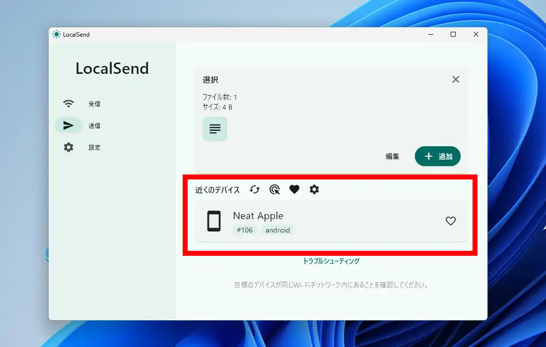 左のメニューから「送信」に切り替えます。ここでは同じネットワーク内で接続している端末にファイルを送信する事が出来ます。今回はAndroidスマホにファイルを送信してみますが、その場合はAndroid側でもLocalSendを起動させておく必要があります。「近くのデバイス」に端末が表示されている事を確認。