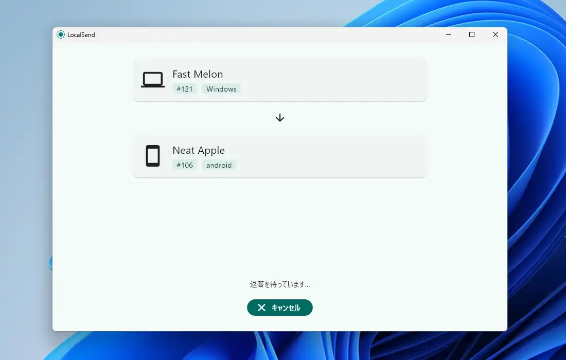 送信が実行されると下のような画面に切り替わります。後は受信側でファイルの受信許可の操作を行う必要があります。