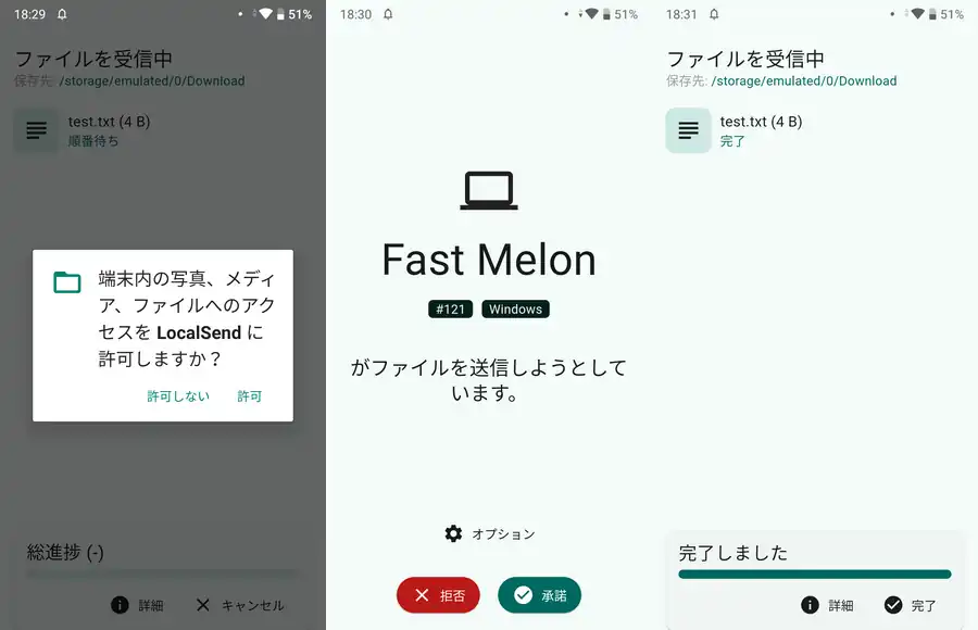 受信側のAndroidスマホでは初回時のみファイルへのアクセスの許可を求める画面が表示されるので「許可」を選択。更に送信されてきたファイルを「拒否」するか「承諾」するかの選択が表示されるので「承諾」で受信開始。後はファイルを受信して完了となります。