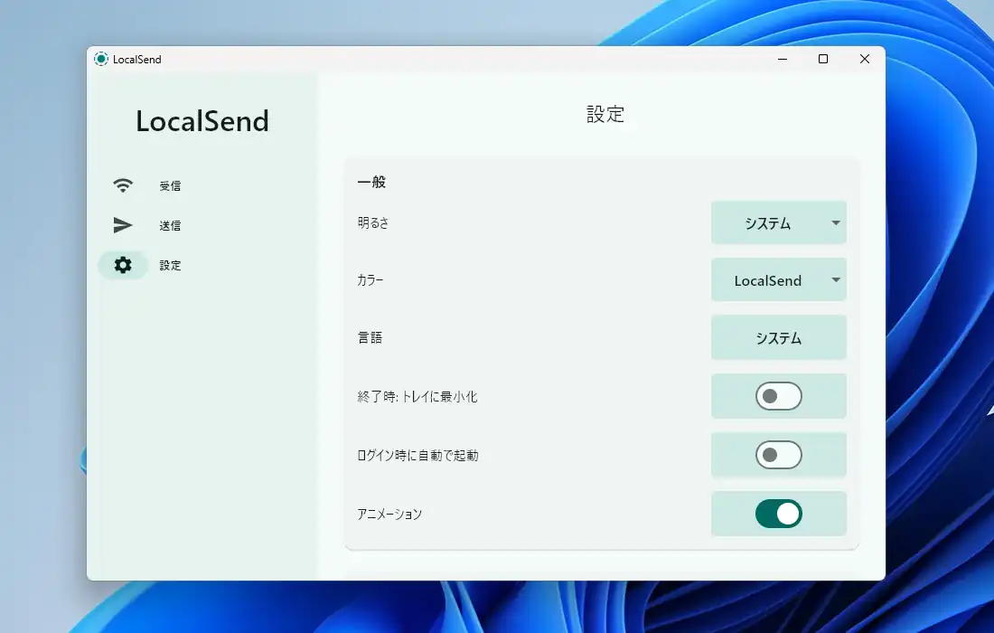 LocalSendの設定を見ていきます。標準のままでも十分に使えますが、幾つか変更しておくと利便性が向上する部分もあります。まず「一般」では外観に関連する設定があり、「明るさ」で「システム」標準の他に「ライト」と「ダーク」にテーマを変更可能。「カラー」は配色の設定、他に「終了時にトレイに最小化」で×ボタンでウィンドウを閉じた時にプログラムを終了せずシステムトレイに最小化、「ログイン時に自動で起動」でスタートアップに登録して自動起動出来ます。