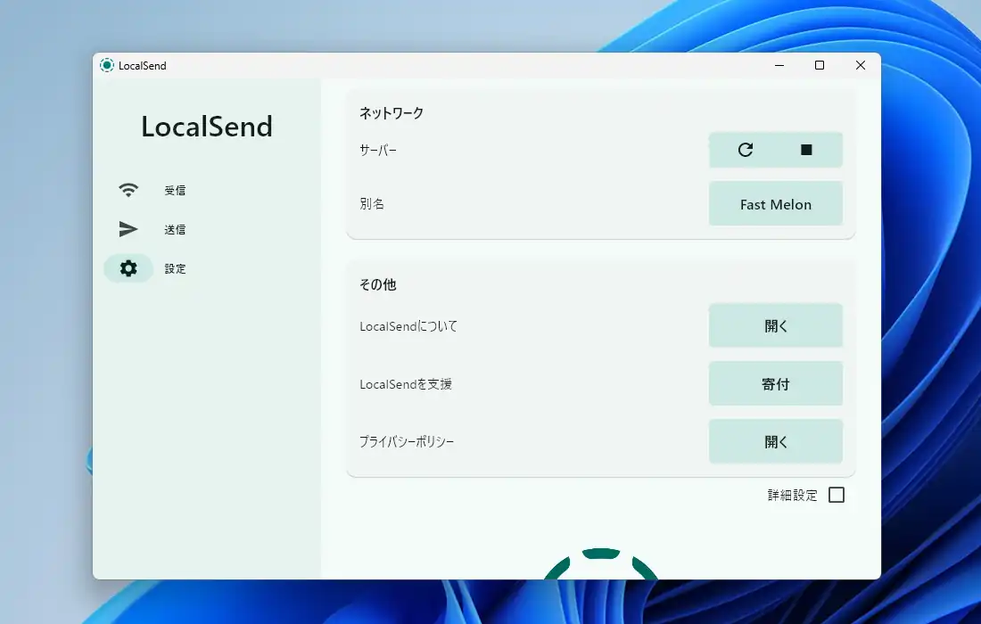 「ネットワーク」を見ていきます。「サーバー」の欄で再起動(画面はそのまま)と停止を実行出来ます。その下の「別名」でデバイスを識別する為の名前を変更出来ます。「その他」の部分はLocalSendに関連する情報や寄付ページ、プライバシーポリシーページへのリンクとなっています。
