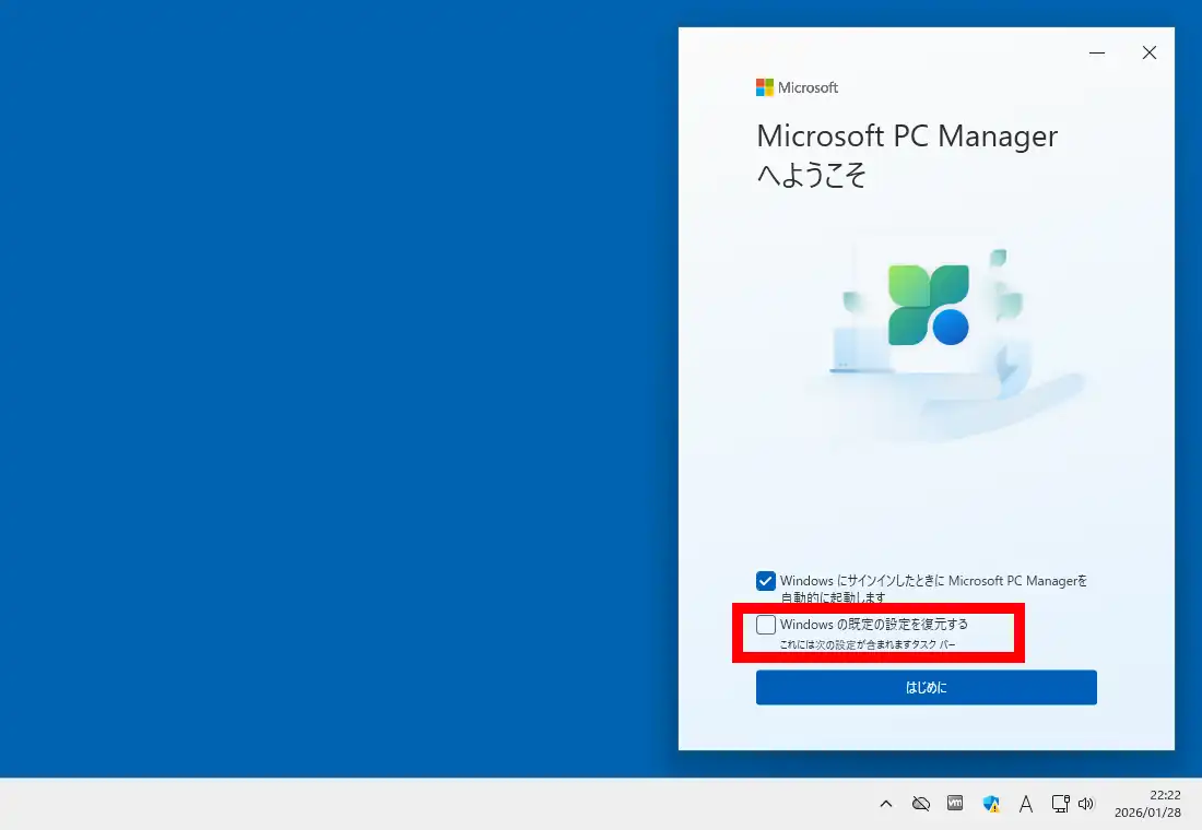 PC Managerインストール直後に初期設定画面が表示されます。「Windowsにサインインしたとき…」にチェックを入れているとPC Managerをスタートアップに登録、「Windowsの既定の設定を復元する」は自身で変更したタスクバーの設定が元に戻されてしまうのでチェックを外しておく事をお勧めします。確認後、「はじめに」で進みます。