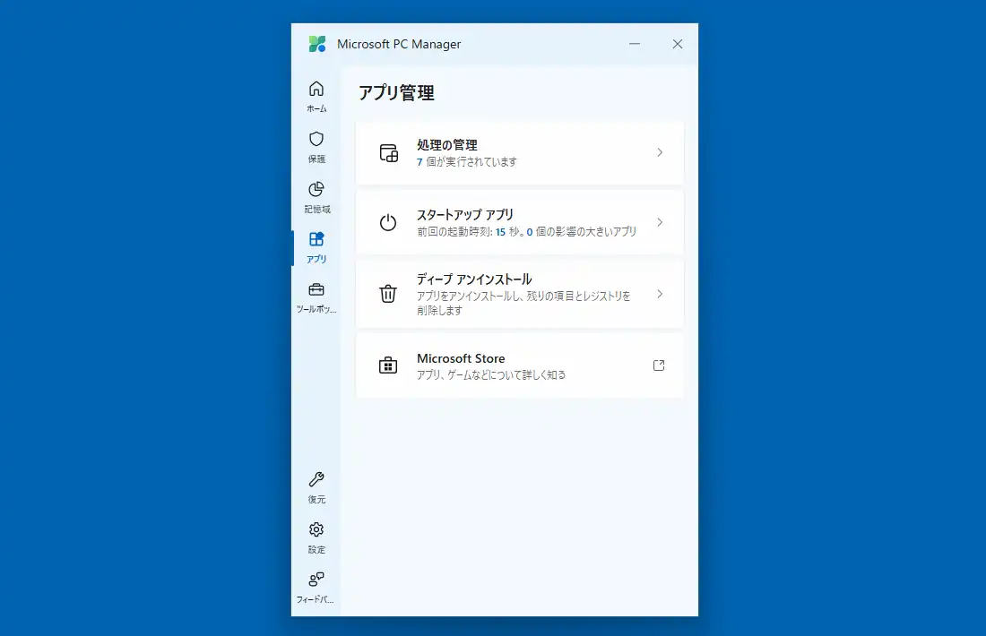 「アプリ管理」画面にある「処理の管理」はホーム画面にあった「プロセス」と同じ、その下の「スタートアップアプリ」もホーム画面にあった「起動」と同じ機能です。「ディープアンインストール」についてはWindows標準以上の機能で、標準ではアプリが用意したアンインストーラを実行するだけなのに対して、ディープアンインストール機能は通常のアンインストールに加えてアプリが残したフォルダやファイル、レジストリを削除します。ただ、どこまで削除出来ているのかは不明。最下部の「Microsoft Store」は単にMicrosoft Storeを起動するだけです。