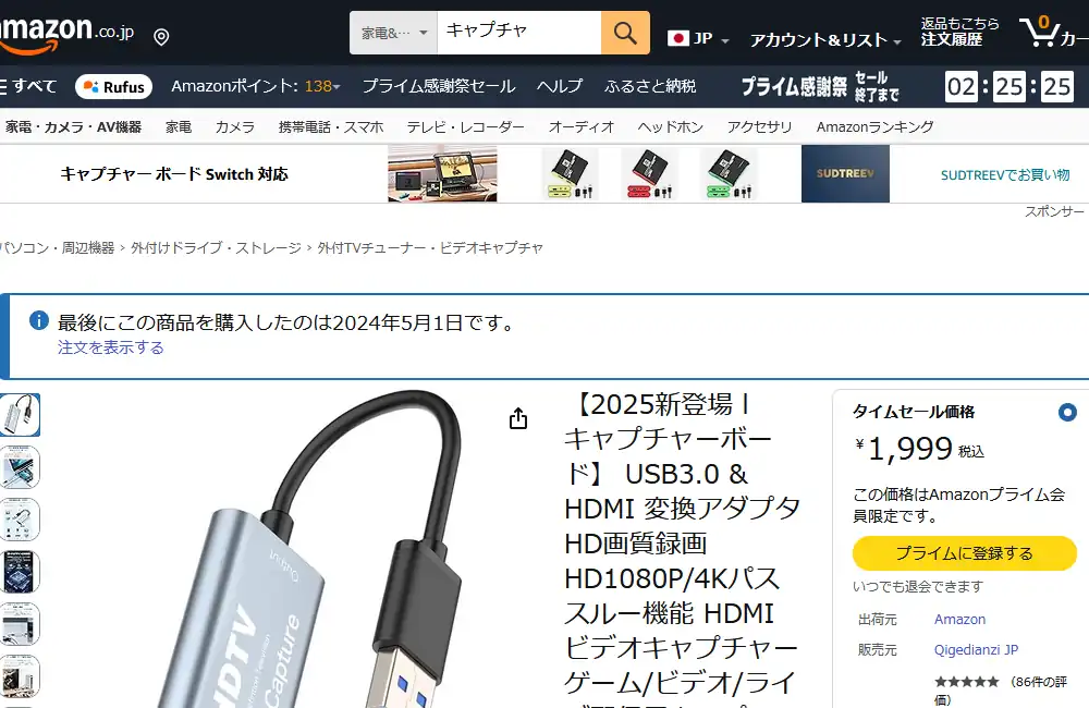 筆者が購入したのはAmazonで販売していた下の製品。いつ購入したかも忘れていましたが、確認すると昨年の5月でした。製品名は存在しないのか意図的に出していないのか分かりませんが、当時は2024年最新キャプチャーボードとして販売されていたのを記憶しています。