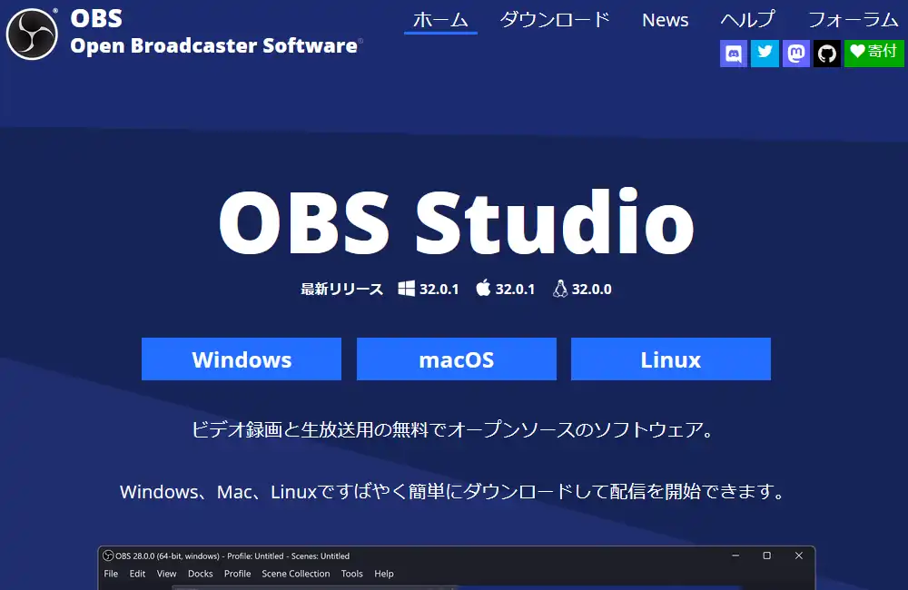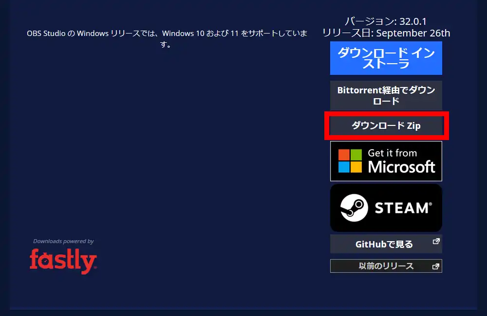 OBS公式サイトを表示して「Windows」となっているリンクをクリックすればWindows用インストーラが即ダウンロードされます。インストーラタイプじゃない物を使用したい場合は上部メニューにある「ダウンロード」からダウンロードページを表示。