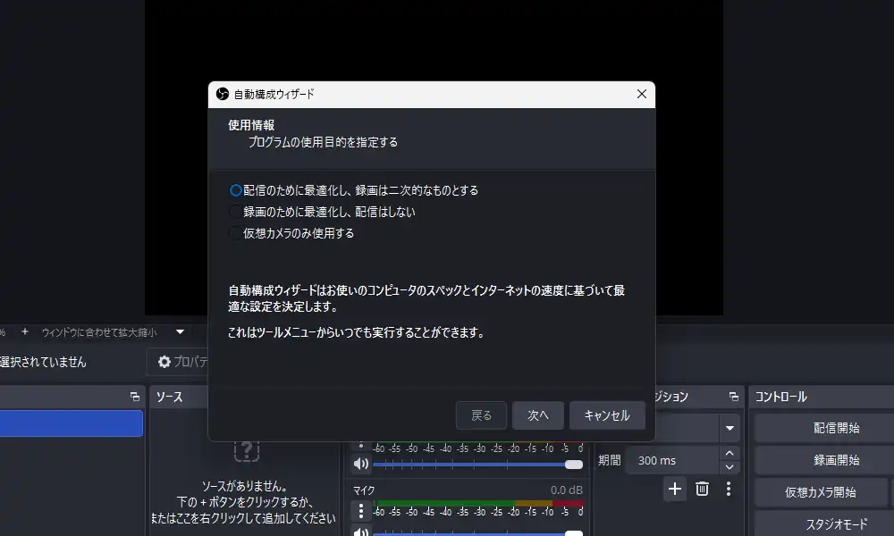 OBS初回起動時、「自動構成ウィザード」が最初に起動します。最初にプログラムの使用目的を選択しますが、筆者の様なキャプチャ用途なら「録画のために最適化…」を選択して進みます。更に解像度やFPS(1秒間のフレーム数)の選択があり、最後に用途に応じて最適化されます。