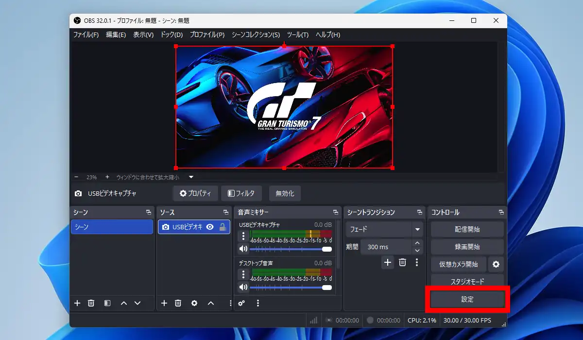 今回はキャプチャ機にゲーム機を接続していますがOBSの画面内にしっかりと表示されているのが確認出来ます。この状態で右にある「コントロール」の「録画開始」で動画としてキャプチャ出来る状態ですが、その前に「設定」ボタンから幾つかの設定を見ていきます。