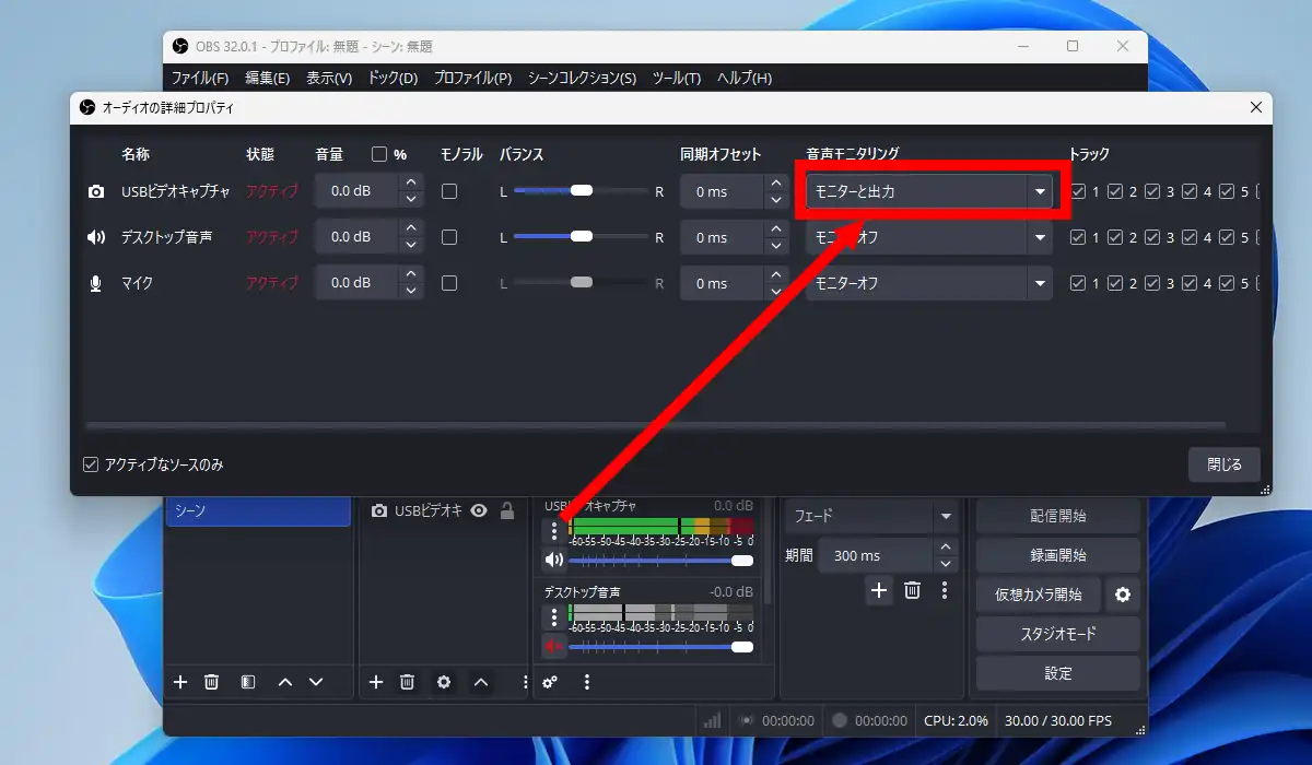 また、USBキャプチャ経由での音声を流したいといった場合は音声ミキサーの3点ボタンにあるメニューの「オーディオの詳細プロパティ」を開き該当するデバイスの音声モニタリングを「モニターオフ」から「モニターと出力」に変更。これでキャプチャ元の音声をディスプレイ内蔵スピーカーなどで流す事が出来ます。