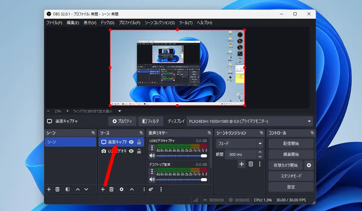 他、今回の件とは関係無い話となりますが、OBSはデスクトップ動画キャプチャも優秀です。ソース欄の+ボタンから「画面キャプチャ」を選択して追加で使用出来ます。PCゲームのプレイ映像を録画したいといった用途ならこの機能や指定のウィンドウのみをキャプチャするウィンドウキャプチャを使用します。