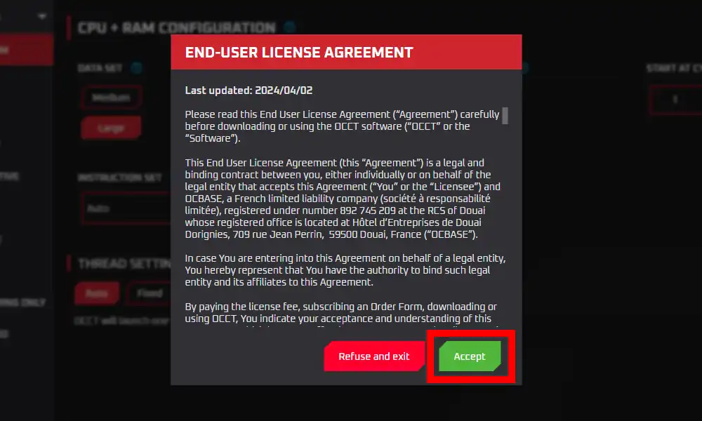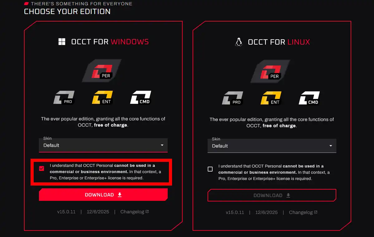 OCCTの公式サイトからリンクを辿りダウンロードページを開きます。Windows用とLinux用に分かれていますが、どちらも「I understand that OCCT…」の部分にあるチェックボックスをクリックしてチェックを入れないとダウンロード出来ません。因みに英文を要約すると企業や商用では利用出来ない事を理解しているといった内容となっています。後は「DOWNLOAD」ボタンからダウンロードを実行。