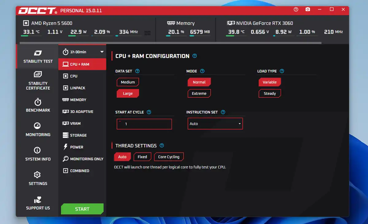 目的のテスト項目を選択後、「START」で実行しますが無料版の場合は直ぐに実行されません。OCCTのサブスクリプションの広告が10秒間表示され、終了後に再び下部にある「START」をクリックして実際にテストが開始します。